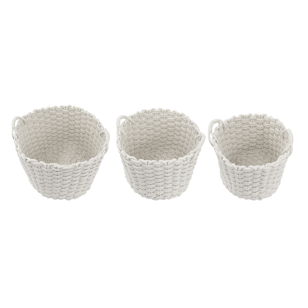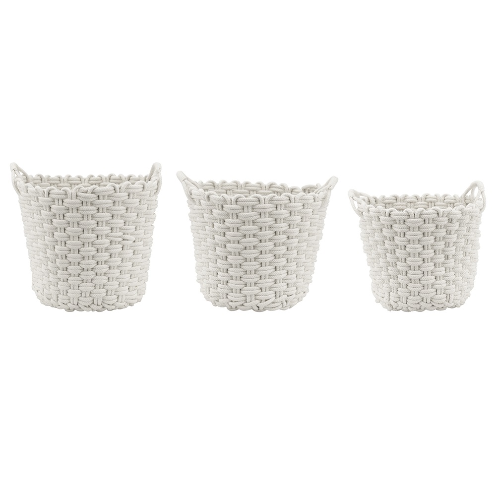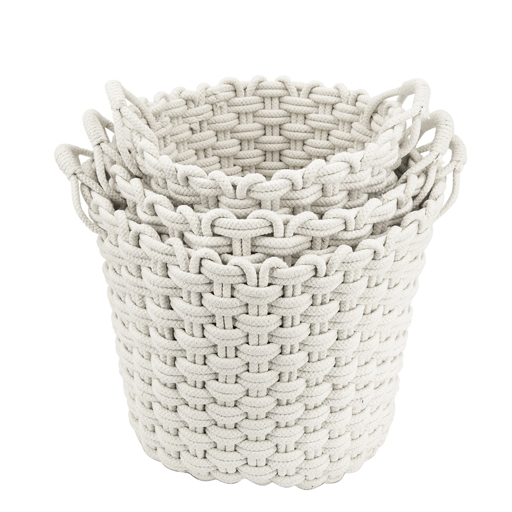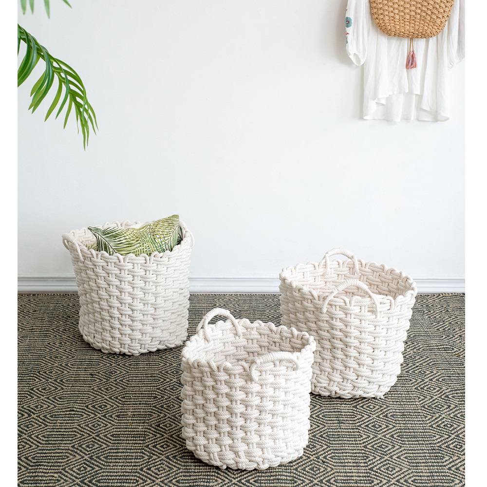 Looking for an eye-catching natural basket set then these baskets are for you. Made of natural cotton rope and woven into these three baskets. The perfect accent pieces for an earthy simple décor in any room ready to catch toys left behind, coral books or simply to keep a blanket on hand. Great for any home this set can be used together in the same room or separate in multiple rooms as catch-all baskets. The solid white circular shaped baskets add a pleasing aesthetic feel throughout your home.